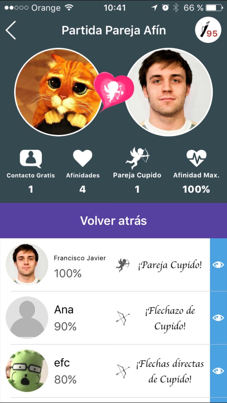 Si consigues el 98% de afinidad en la partida, eres Pareja Cupido y contactáis directamente sin necesidad de gastar una flecha de Cupido